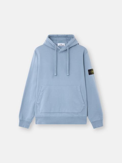 Hooded sweatshirt in organic cotton fleece, featuring a pouch pocket, raglan sleeves on the back, overlock seams, and ribbed trims. Midweight. Garment dyed. FABRIC RESEARCH AND TREATMENT Hooded sweatshirt in organic cotton fleece. Midweight. Garment dyed. STYLE AND FIT Drawstring hood. Pouch pocket with angled openings and internal tape reinforcement. Lunette under back neckline with internal reinforcement. Raglan sleeves on back. Stone Island badge on left sleeve. Ribbed cuffs and bottom band. Overlock stitching at seams. Regular fit. COMPOSITION AND CARE External Fabric: 100% Cotton Ribbing: 98% Cotton 2% Elastane / Spandex