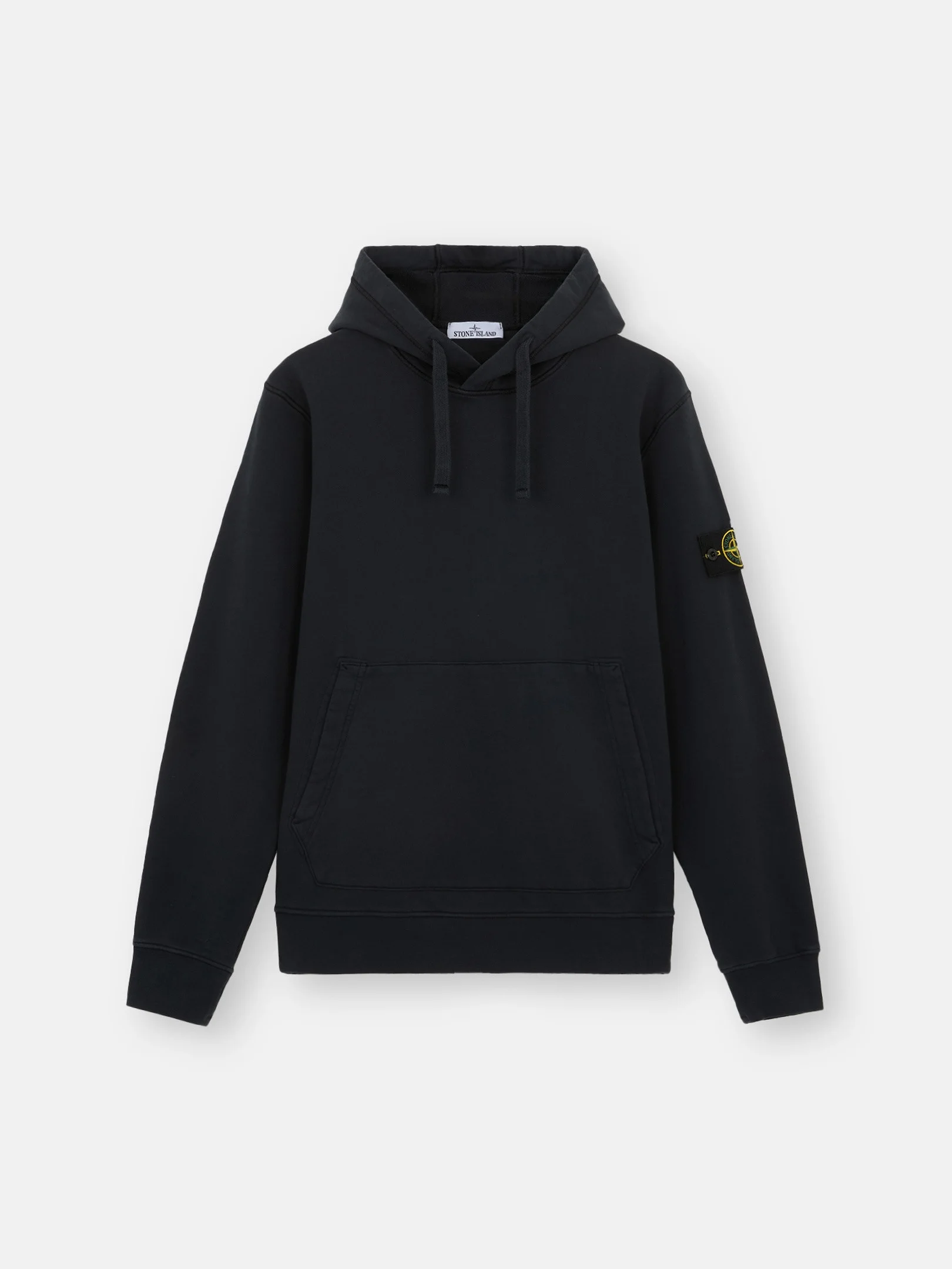 Hooded sweatshirt in organic cotton fleece featuring overlock seams, a pouch pocket with slanted entrances, and elasticated ribbed trims. Garment dyed. FABRIC RESEARCH AND TREATMENT Hooded sweatshirt in organic cotton fleece. Garment dyed. STYLE AND FIT Drawstring hood. Overlock seams. Pouch pocket with slanted entrances. Stone Island badge on left sleeve. Lunette under back neckline with inner lining. Elasticated ribbed cuffs and bottom band. Regular fit. COMPOSITION AND CARE External Fabric: 100% Cotton. Ribbing: 98% Cotton 2% Elastane / Spandex