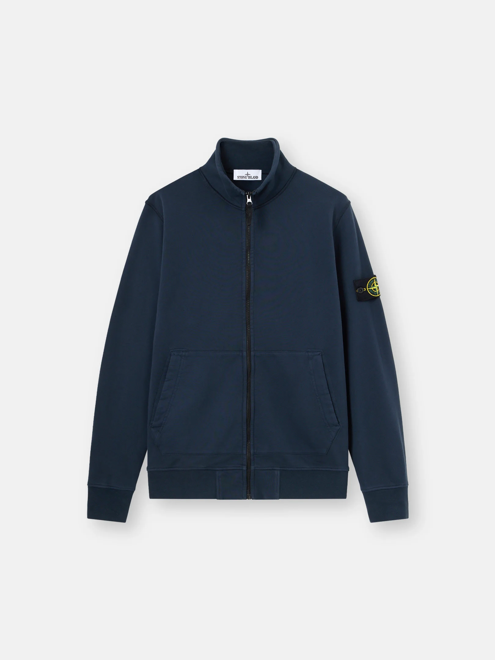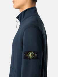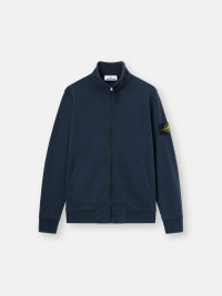 Sweatshirt in organic cotton fleece with standing collar, overstitch seams, patch pockets, a lunette detail under the back neckline, and zipper fastening. Garment dyed. FABRIC RESEARCH AND TREATMENT Full-zipper sweatshirt in organic cotton fleece. Garment dyed. STYLE AND FIT Standing collar. Overstitch seams. Patch pockets with slanted entrance. Stone Island badge on the left sleeve. Ribbed cuffs and bottom band. Lunette with inner lining under back neckline. Zipper fastening. Regular fit. COMPOSITION AND CARE External Fabric: 100% Cotton. Ribbing: 98% Cotton 2% Elastane / Spandex
