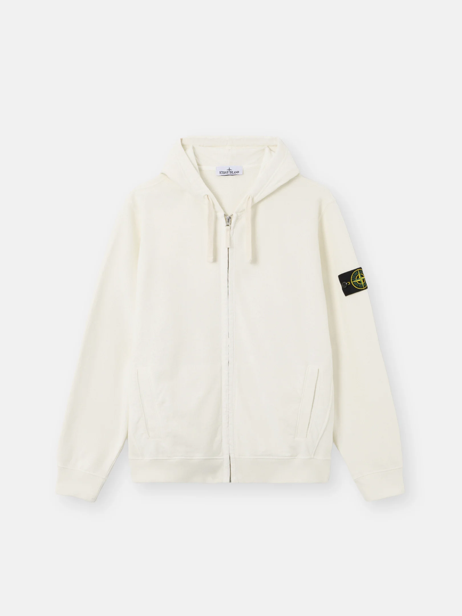 Hooded zipper-up sweatshirt in brushed organic cotton fleece featuring hand pockets, jersey-lined hood, inner pockets, and hidden zipper fastening. Garment dyed. FABRIC RESEARCH AND TREATMENT Hooded zipper-up sweatshirt in brushed organic cotton fleece. Garment dyed. STYLE AND FIT Drawstring hood with cotton jersey lining. Standing hand pockets with ribbed cotton trim and inner cotton tape reinforcement. Two inner pockets. Ribbed side bands. Stone Island badge on left sleeve. Elasticated ribbed cuffs and bottom band. Zipper fastening hidden under cotton trim. Regular fit. COMPOSITION AND CARE External Fabric: 100% Cotton. Secondary Fabric: 99% Cotton 1% Elastane / Spandex. Garment Details: 100% Cotton. Hood Lining: 100% Cotton