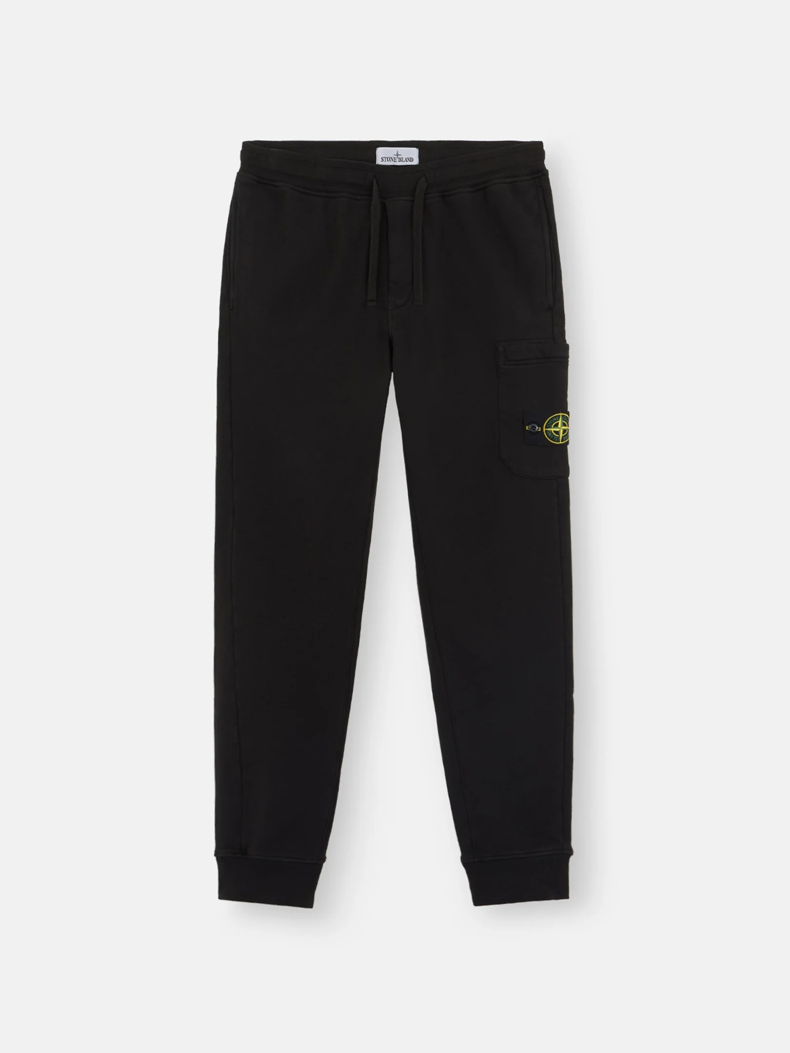 Sweatpants in organic cotton fleece, featuring a zipper pocket on the leg, elasticated cuffs, and an elasticated drawstring waistband with zipper fly. Garment dyed. FABRIC RESEARCH AND TREATMENT Sweatpants in organic cotton fleece. Garment dyed. STYLE AND FIT Standing hand pockets. One back pocket with snap under fixed band. Patch pocket on left leg with hidden zipper and Stone Island badge. Overlock inner leg seams. Elasticated ribbed cuffs. Elastic drawstring waist. Zipper fly. Slim fit. COMPOSITION AND CARE External Fabric: 100% Cotton. Ribbing: 98% Cotton 2% Elastane / Spandex
