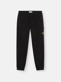 Sweatpants in organic cotton fleece, featuring hand pockets, a cargo pocket with concealed zipper, elasticated drawstring waistband, and ribbed cuffs. Midweight. Garment dyed. FABRIC RESEARCH AND TREATMENT Sweatpants in organic cotton fleece. Midweight. Garment dyed. STYLE AND FIT Vertical hand pockets. Patch cargo pocket on left leg with concealed zipper fastening and Stone Island badge. Angled back pocket with fixed flap and concealed snap. Elasticated ribbed cuffs and waistband with external drawstring. Slim fit. COMPOSITION AND CARE External Fabric: 100% Cotton Ribbing: 98% Cotton 2% Elastane / Spandex