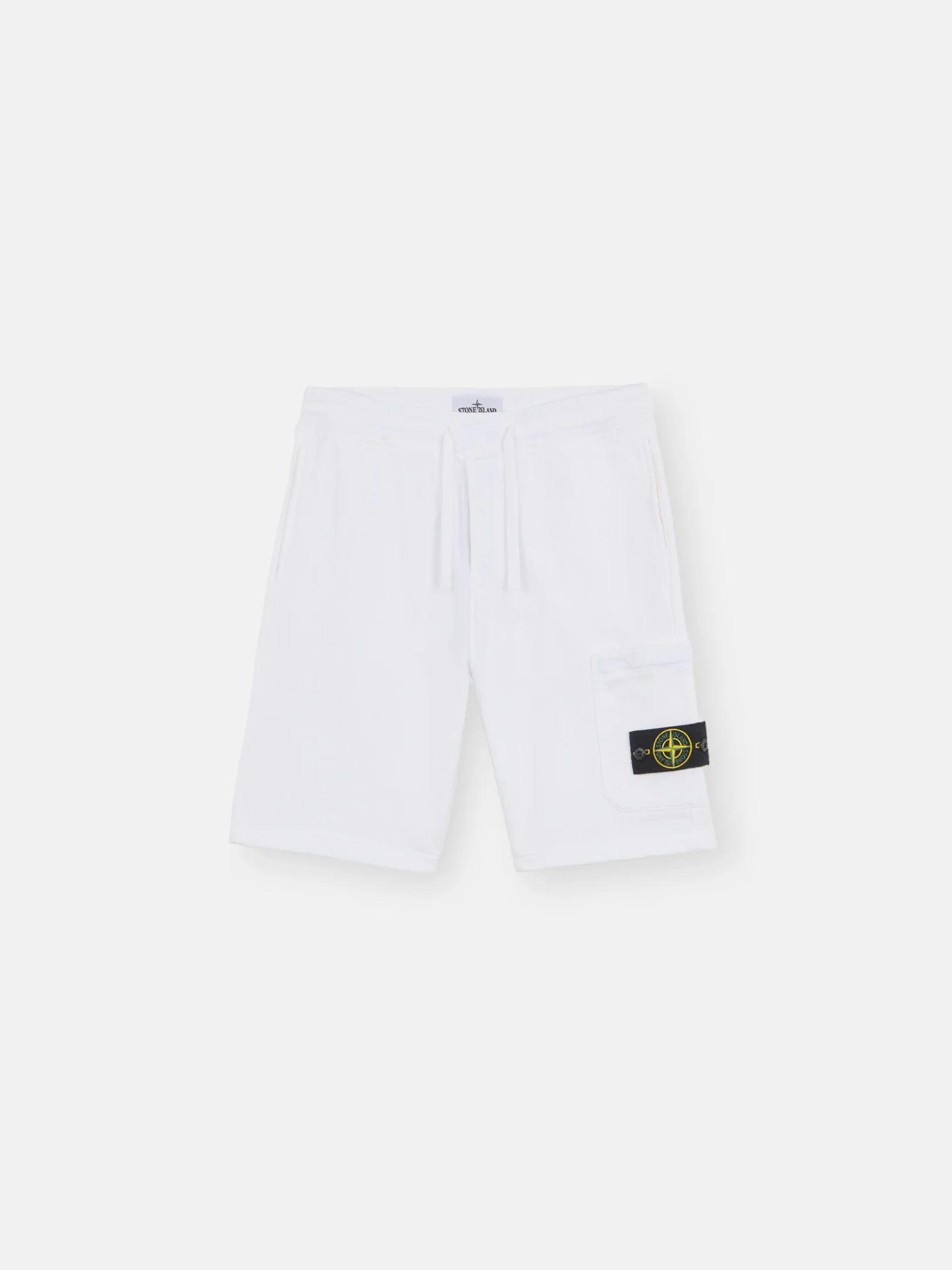 Bermuda shorts in organic cotton fleece, featuring a zipper pocket on the left leg, back flap pocket, and elasticated drawstring waistband with zipper fly. Garment dyed. FABRIC RESEARCH AND TREATMENT Bermuda shorts in organic cotton fleece. Garment dyed. STYLE AND FIT Standing hand pockets. One pocket on back with fixed flap and hidden snap. Patch pocket on left leg with hidden zipper and Stone Island badge. Elasticated waistband with drawstring. Zipper fly. Overlock seams. Regular fit. COMPOSITION AND CARE External Fabric: 100% Cotton. Ribbing: 98% Cotton 2% Elastane / Spandex. Pocket Bag: 100% Cotton