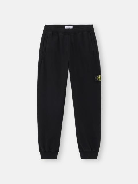 Sweatpants in brushed organic cotton fleece featuring multiple pockets, ribbed cuffs and an elastic waistband with inner drawstring. Garment dyed. FABRIC RESEARCH AND TREATMENT Sweatpants in brushed organic cotton fleece. Garment dyed. STYLE AND FIT Standing hand pockets. One back pocket with snap under fixed band. Stone Island badge on left leg. Elasticated ribbed cuffs. Elastic waistband with inner drawstring. Regular fit. COMPOSITION AND CARE External Fabric: 100% Cotton. Ribbing: 99% Cotton 1% Elastane / Spandex