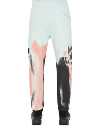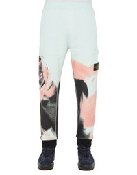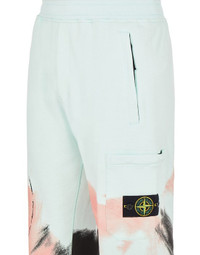FABRIC RESEARCH AND TREATMENT MOTION SATURATION': Sweatpants in brushed cotton fleece. Garment dyed. STYLE 'Motion Saturation' print on legs and front and back, featuring mixed printing techniques on the finish piece, including colored corrosion, forming the Stone Island Compass logo, and a brushed rotational motif. In-seam pockets with hidden zipper fastening. One back pocket with hidden snap fastening. Pocket on one leg, featuring the Stone Island badge. Ribbed waistband with inner drawstring. Ribbed leg bottoms. DETAILS Width at end: 14.0 cm COMPOSITION 100% Cotton