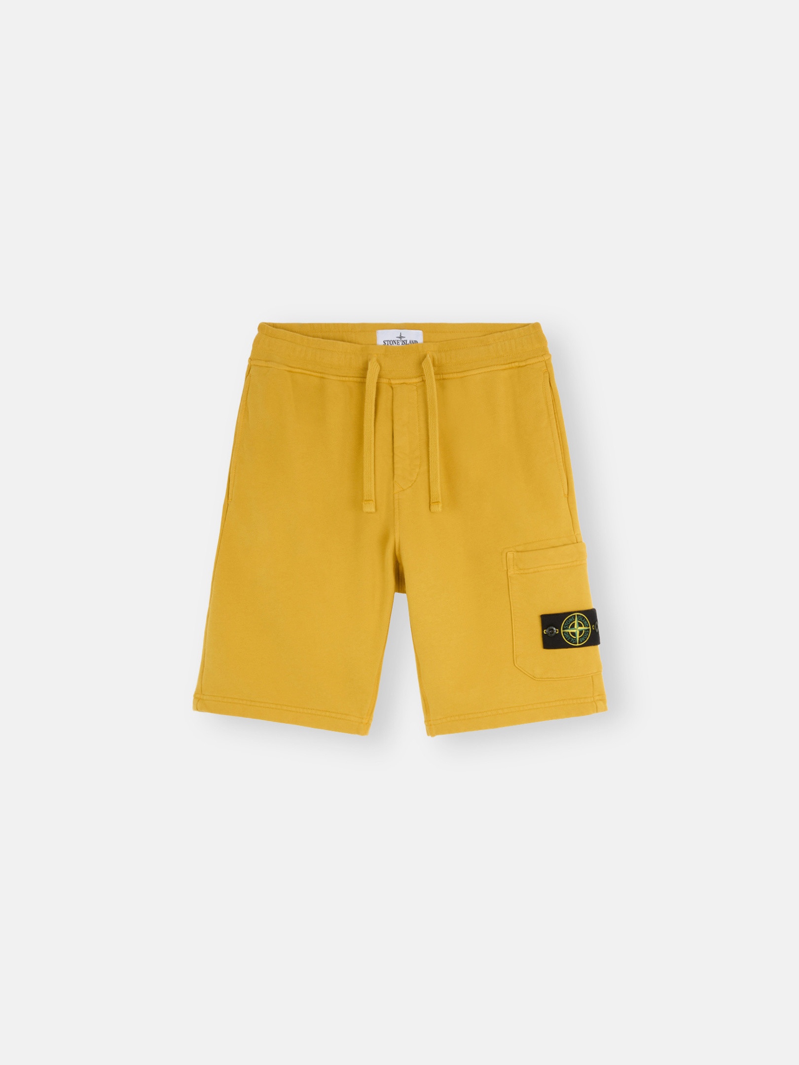 Cargo Bermuda shorts in cotton fleece featuring hand pockets, a patch pocket on the left leg with hidden horizontal zipper, and a drawstring waistband. Garment dyed. FABRIC RESEARCH AND TREATMENT Cargo Bermuda shorts in cotton fleece. Garment dyed. STYLE AND FIT Welt hand pockets. One patch pocket on the left leg, with horizontal hidden zipper closure; the pocket features the Stone Island badge. Ribbed waistband with outer drawstring. Zipper fly. Regular fit. COMPOSITION AND CARE External Fabric: 100% Cotton. Trim: 100% Cotton