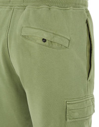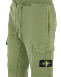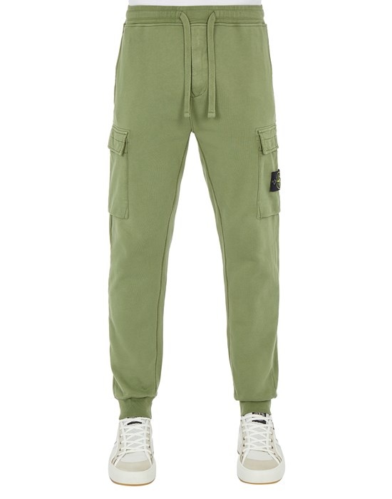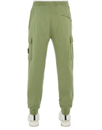FABRIC RESEARCH AND TREATMENT COTTON FLEECE_GARMENT DYED: Jogging pants in cotton fleece. Garment dyed. STYLE Regular fit. In-seam hand pockets. One back pocket with hidden snap fastening. One bellows pocket on each leg, with flap and hidden snap fastening; the left one bears the Stone Island badge. Ribbed leg bottoms. Ribbed waistband with drawstring. Zipper fly. DETAILS Width at end: 16.0 cm COMPOSITION External fabric: 100% Cotton TRIM: 100% Cotton