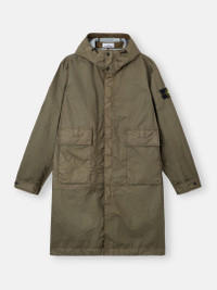 Long hooded parka in a light three-layer performance fabric, featuring snap and zip-fastened pockets, adjustable cuffs, and a concealed two-way zipper. Garment dyed with anti-drop. FABRIC RESEARCH AND TREATMENT Long hooded parka in Membrana 3L TC, a three-layer light performance fabric made from an opaque nylon outer face laminated to a breathable, water-resistant membrane, protected by an imperceptible polyester base. Stone Island's garment dyeing expertise gives an outstanding color to the outer face while preserving the performance features of the inner membrane. The addition of a special agent to the dye formula makes the piece anti-drop. STYLE AND FIT Hood with elasticated drawcord and stoppers. Bellows hand pockets with flap and concealed snap on nylon tape, with second vertical concealed zipper pocket. Back bellows pocket with flap and concealed snap on nylon tape. Internal top-entry pocket. Stone Island badge on left sleeve. Adjustable cuffs with strap and snap. Concealed two-way zipper and snap fastening. COMPOSITION AND CARE External Fabric: Outer Layer: 100% Polyamide / Nylon Membrane: 100% Polyurethanic Resin Inner Layer: 100% Polyester Secondary Fabric: 100% Polyamide / Nylon Coating: 100% Polyurethanic Resin