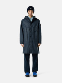 Long hooded parka in cotton-polyester canvas coated with pigmented wax for a textured outer finish and a glossy rubberized reverse, featuring storm flaps, a drawstring waist, and two-way zipper. FABRIC RESEARCH AND TREATMENT Long hooded parka in a white cotton-polyester canvas in an intimate blend that is colored through the application of a pigmented wax coating with a writing effect on the outer face and a glossy rubberized coating in matching tone on the reverse. STYLE AND FIT Hood with fixed elasticated drawcord and stopper. Fixed storm flaps on front. Angled hand pockets with concealed snap. Elasticated drawcord at waist. Stone Island badge on left sleeve. Internal elasticated cuffs. Two-way zipper fastening under snap placket. Internal mesh on upper back. COMPOSITION AND CARE External Fabric: 65% Polyester 35% Cotton - Excluding The Coating Lining: 100% Polyamide / Nylon