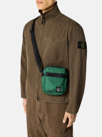 Pouch bag in Nylon Metal made using ECONYL® regenerated yarns with a polyurethane coating, featuring multiple pockets, an adjustable strap with buckle, and top zipper fastening. FABRIC RESEARCH AND TREATMENT Pouch bag in Nylon Metal fabric with polyurethane coating. The evolution of this iconic fabric sees the use of ECONYL® regenerated yarns: the life-ended nylon, pre- and post-consumer, is recycled with a complex depolymerization process to create this fiber that features the same intrinsic characteristics of nylon from fossil raw material. STYLE AND FIT Bellows zipper pocket with Compass logo patch on front. Pocket with fixed flap and snap on back. Internal pocket with snap. Adjustable nylon tape strap with buckle. Top zipper fastening. COMPOSITION AND CARE External Fabric: 100% Polyamide / Nylon Coating: 100% Polyurethanic Resin Lining: 100% Polyamide / Nylon