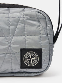 Wrist pouch in quilted iridescent Nylon Metal made from ECONYL® regenerated yarns, featuring a nylon strap, snap back pocket, and four inner compartments. FABRIC RESEARCH AND TREATMENT Wrist pouch in Stone Island's iridescent Nylon Metal fabric with polyurethane coating. The evolution of this iconic fabric sees the use of ECONYL® regenerated yarns: the life-ended nylon, pre- and post-consumer, is recycled with a complex depolymerization process to create this fiber that features the same intrinsic characteristics of nylon from fossil raw material. STYLE AND FIT All-over padding. Nylon tape wrist strap. Stone Island Compass logo patch on front. Snap pocket on back. Top zipper fastening. Nylon ripstop lining. Four inner compartments. COMPOSITION AND CARE External Fabric: 100% Polyamide / Nylon. Coating: 100% Polyurethanic Resin. Lining: 100% Polyamide / Nylon. Padding: 100% Polyester