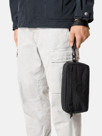 Pouch in Nylon Metal made with ECONYL® regenerated yarns, featuring all-over padding, front and back pockets, inner compartments, zipper, and nylon tape hand strap. FABRIC RESEARCH AND TREATMENT Pouch made from the responsible Stone Island iridescent Nylon Metal fabric. The evolution of this iconic fabric sees the use of ECONYL® regenerated yarns: the life-ended nylon, pre- and post-consumer, is recycled with a complex depolymerization process to create this fiber that features the same intrinsic characteristics of nylon from fossil raw material. STYLE AND FIT All-over padding. Front pocket with horizontal zipper fastening featuring raised embroidery of Stone Island Compass logo. Back pocket with horizontal zipper fastening. Four inner compartment pockets. Top zipper fastening. Nylon tape hand strap. COMPOSITION AND CARE Garment: 100% Polyamide / Nylon. Lining: 100% Polyester. Coating: 100% Polyurethanic Resin. Padding: 100% Polyester