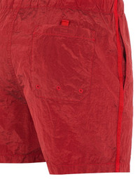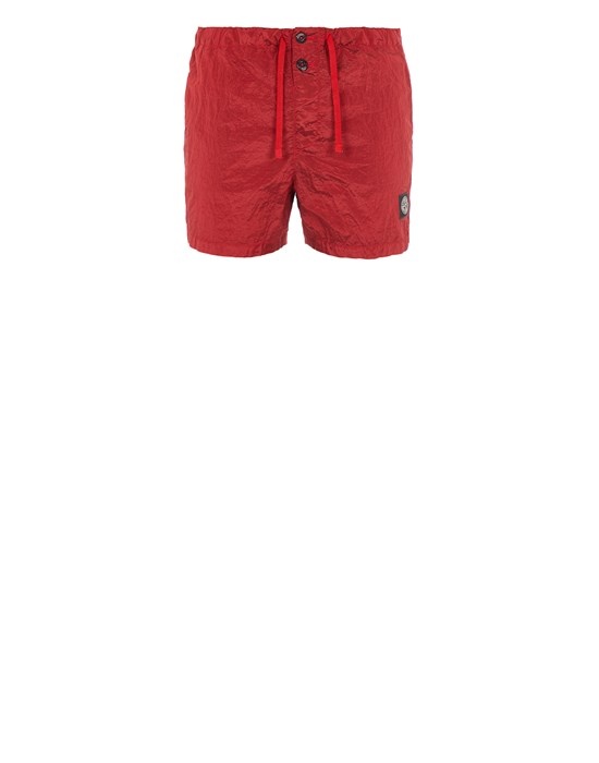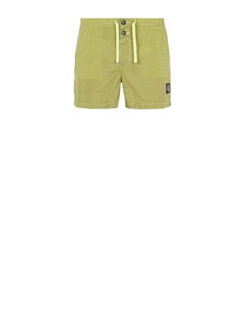 FABRIC RESEARCH AND TREATMENT NYLON METAL IN ECONYL® REGENERATED NYLON: Swimming trunks made in a new responsible Stone Island iridescent Nylon Metal fabric. The evolution of this iconic fabric sees the use of ECONYL® regenerated yarns: end-of-life, pre- and post-consumer nylon is recycled with a complex depolymerization process to create this yarn which boasts the same intrinsic characteristics of raw-material, first-fossil nylon. The fabric is resin treated inside for light water and wind resistance. The finished piece then undergoes an elaborate double dye procedure. COMPOSITION External fabric: 100% Polyamide / Nylon Lining: 100% Polyamide / Nylon