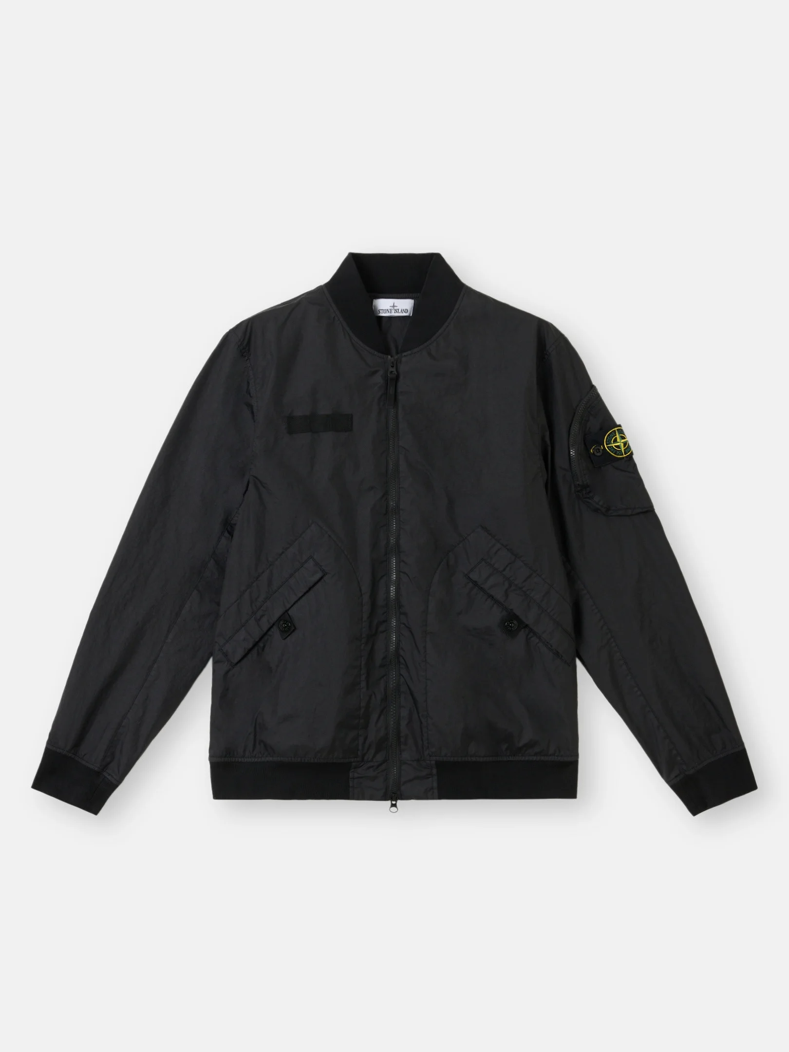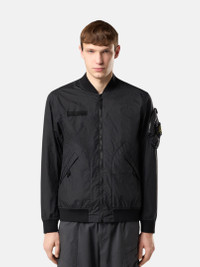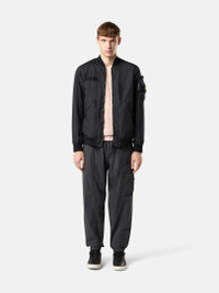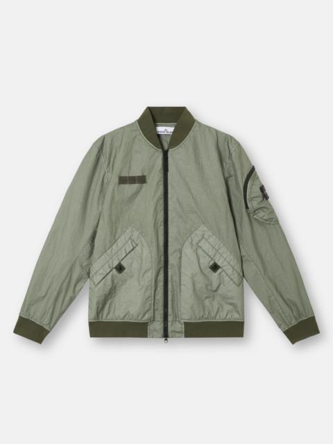 Bomber jacket in a three-layer light performance fabric protected by an imperceptible polyester base, featuring tape applique with loops on chest and a back vent. Garment dyed. FABRIC RESEARCH AND TREATMENT Bomber jacket made of Membrana 3L TC, a three-layer light performance fabric made from an opaque nylon outer face laminated to a breathable, water-resistant membrane, protected by an imperceptible polyester base. Stone Island's garment dyeing expertise gives an outstanding color to the outer face while preserving the performance features of the inner membrane. The addition of a special agent to the dye formula makes the piece anti-drop. STYLE AND FIT Ribbed collar. Nylon tape applique with loops on chest. Slanted hand pockets with snap fastening on tape. Rounded bellows pocket on the left sleeve with zipper fastening and Stone Island badge. Back vent with snap fastening on tape. Ribbed cuffs and bottom band. Two-way zipper fastening. COMPOSITION AND CARE External Fabric: Outer Layer: 100% Polyamide / Nylon. Membrane: 100% Polyurethanic Resin. Inner Layer: 100% Polyester. Ribbing: 95% Polyamide / Nylon 5% Elastane / Spandex. Yoke Lining: 100% Polyamide / Nylon