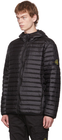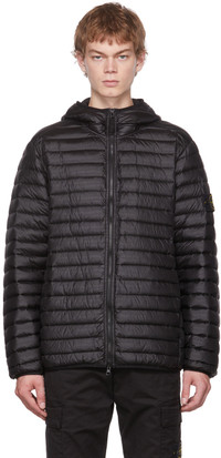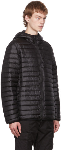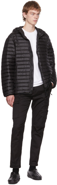 Down-filled quilted nylon satin jacket. · Hood at stand collar · Zip closure · Zip pockets · Detachable logo patch at sleeve · Elasticized cuffs and hem · Patch pockets at interior · Full satin lining Supplier color: Black Supplier code: 771540324 Fill: 90% down, 10% feather.