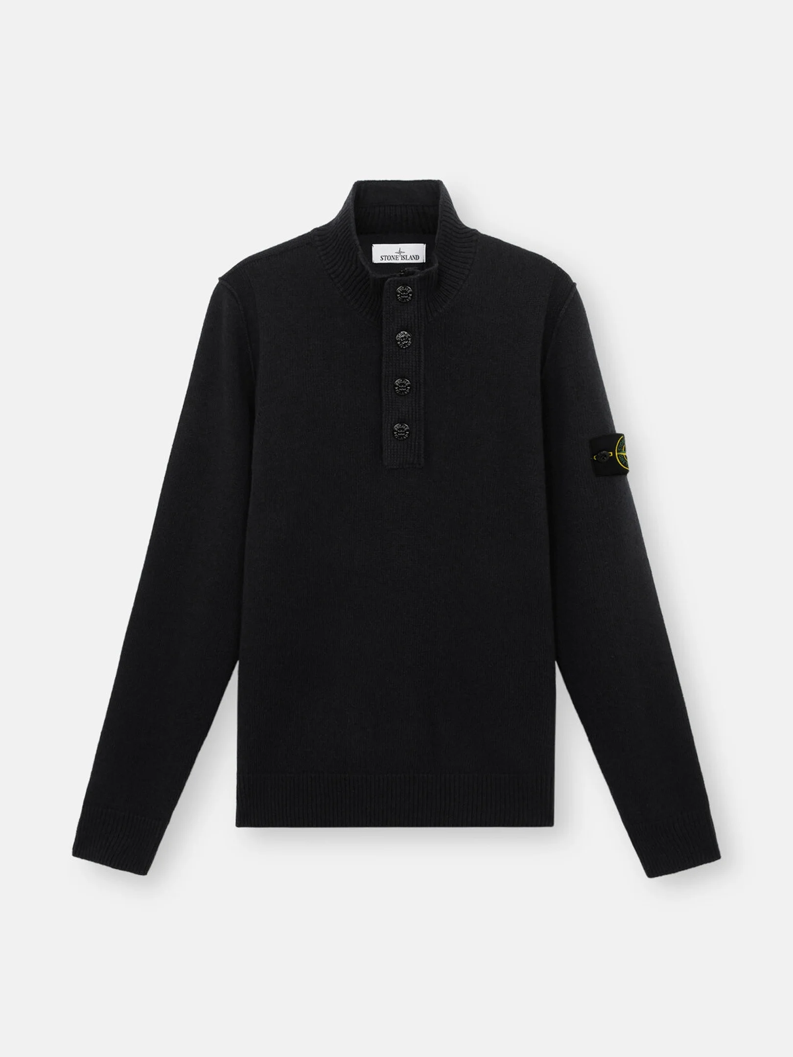Knit half-zipper sweater in a lamb wool and nylon blend featuring a felt-lined button placket, ribbed collar with inner felt trim, and reverse stitch bands. Gauge 7. FABRIC RESEARCH AND TREATMENT Knit half-zipper sweater in lamb wool and nylon blend. Stockinette stitch. Gauge 7. STYLE AND FIT Ribbed stand collar with inner felt trim and zipper neck fastening under button felt-lined placket. Reverse stitch band at shoulders and along armholes. Stone Island badge on left sleeve. Ribbed cuffs and bottom band. Regular fit. COMPOSITION AND CARE 80% Wool 20% Polyamide / Nylon