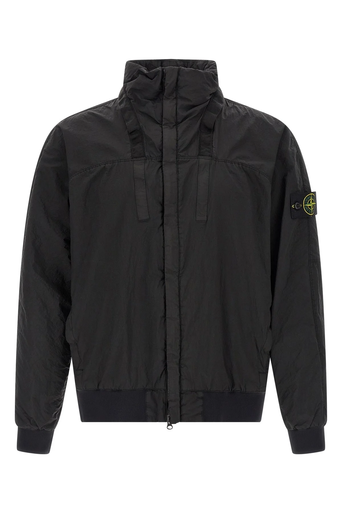 cod. L1S154100064S0020V0029 Slightly water-repellent Nylon Metal Watro bomber jacket with iridescent metallic appearance with ribbed stretch knit details, stand-up collar with removable hood, front hidden zip closure, pockets, long cuffed sleeves, logo badge, headband. Color: Black Size & Fit: true to size fit Composition: 100% polyamide fibers Made in: Albania PROMO CODE NOT APPLICABLE