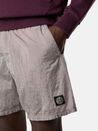 Swim shorts in Nylon Metal made from ECONYL® regenerated yarns, featuring pockets, an elasticated drawstring waistband, and mesh lining. Garment dyed with a double-color recipe. FABRIC RESEARCH AND TREATMENT Swim shorts in Stone Island's iridescent Nylon Metal fabric. The evolution of this iconic fabric sees the use of ECONYL® regenerated yarns: the life-ended nylon, pre- and post-consumer, is recycled with a complex depolymerization process to create this fiber that features the same intrinsic characteristics of nylon from fossil raw material. Garment dyed with a double-color recipe. Nylon mesh lining. STYLE AND FIT Slanted hand pockets. One back pocket with zipper hidden under fixed flap. Stone Island Compass logo patch on lower left leg. Elasticated waistband with inner drawstring. Regular fit. COMPOSITION AND CARE External Fabric: 100% Polyamide / Nylon. Lining: 100% Polyamide / Nylon