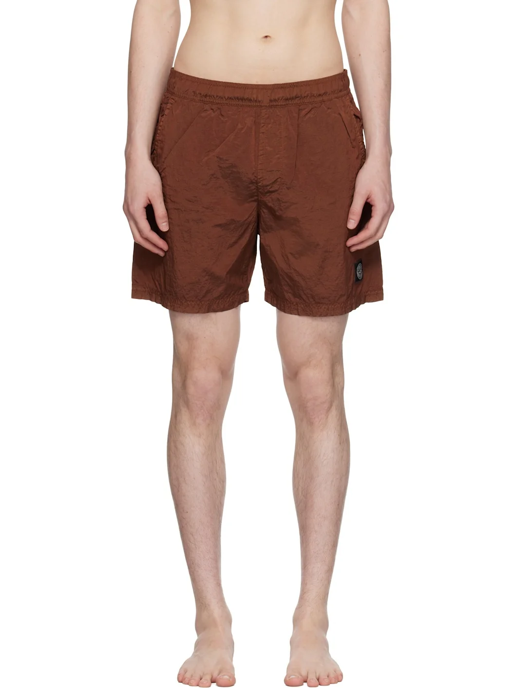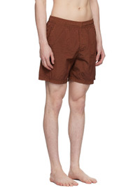Crinkled ECONYL® recycled nylon taffeta swim shorts. · Overdyed · Concealed drawstring at elasticized waistband · Three-pocket styling · Mock fly · Logo patch at cuff · Embroidered eyelets at back · Briefs-style mesh lining Supplier color: Copper Supplier code: B100009 Body: 100% polyamide. Lining: 100% polyamide. Made in Indonesia 251828M208006