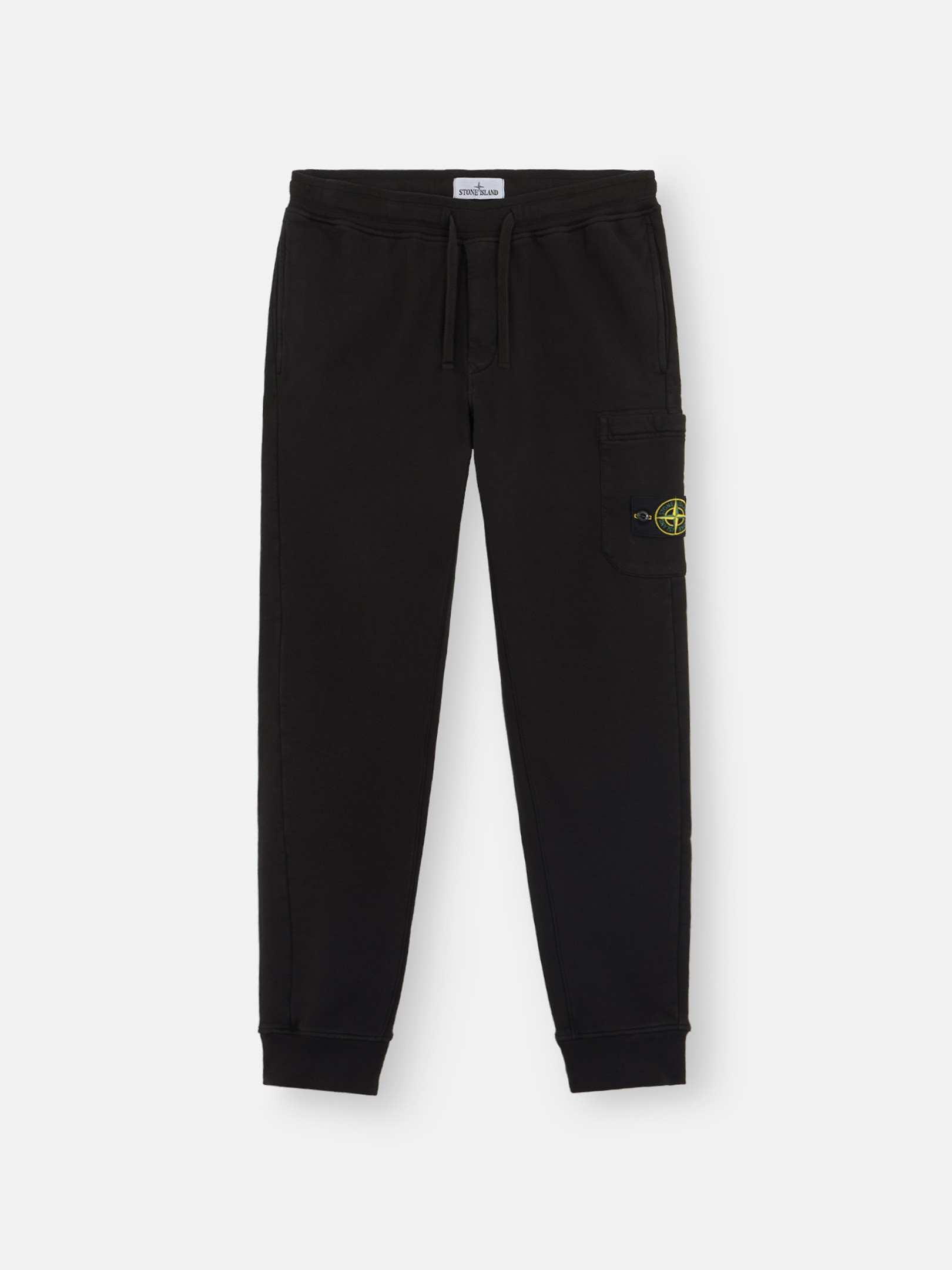 Sweatpants in organic cotton fleece with hand pockets, snap slit pocket on the back, zipper patch pocket on the left leg, and elasticated drawstring waistband. Garment dyed. FABRIC RESEARCH AND TREATMENT Sweatpants in organic cotton fleece. Garment dyed. STYLE AND FIT Welt hand pockets. One slit pocket with hidden snap fastening on the back. Patch pocket with hidden zipper fastening and the Stone Island badge on the left leg. Overlock seams on inner legs. Ribbed cuffs at bottom. Elasticated waistband with outer drawstring. Slim fit. COMPOSITION AND CARE External Fabric: 100% Cotton. Trim: 100% Cotton