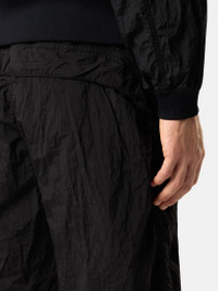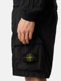 Cargo Bermuda shorts made from Stone Island's iconic Nylon Metal fabric with ECONYL® regenerated yarns, featuring multiple pockets and elasticated waistband with inner drawstring. FABRIC RESEARCH AND TREATMENT Cargo Bermuda shorts made in a new responsible Stone Island iridescent Nylon Metal fabric. The evolution of this iconic fabric sees the use of ECONYL® regenerated yarns: the life-ended nylon, pre- and post-consumer, is recycled with a complex depolymerization process to create this fiber that features the same intrinsic characteristics of nylon from fossil raw material. STYLE AND FIT Slanted hand pockets. Rounded flap on back hiding one zipper-fastened pocket. One bellows patch pocket on the left leg with rounded flap and hidden zipper fastening; the pocket features the Stone Island badge. Elasticated waistband with inner drawstring. Comfort fit. COMPOSITION AND CARE External Fabric: 100% Polyamide / Nylon. Pocket Bag: 100% Polyamide / Nylon