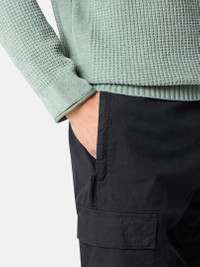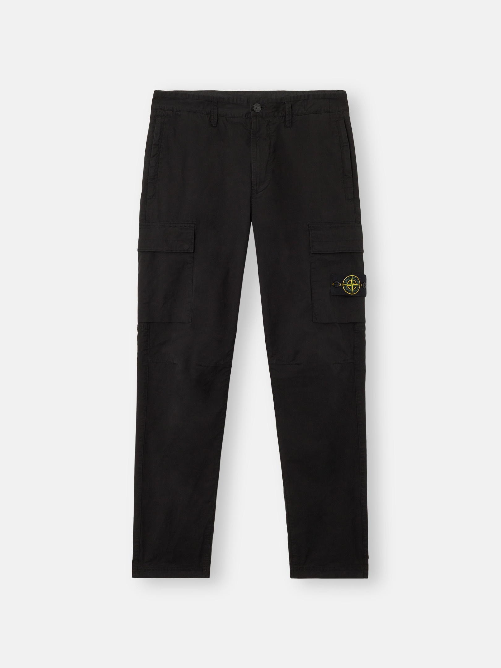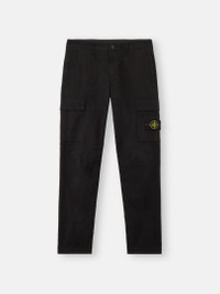 Cargo pants in Supima® stretch cotton twill with zipper hand pockets, snap pocket on the back, and patch snap pocket on the legs. Garment dyed. FABRIC RESEARCH AND TREATMENT Cargo pants in Supima® stretch cotton twill, made with mercerized Supima® cotton yarn, elasticated in the weft. Supima® - Superior Pima - is the guarantee certificate for the US origin of Pima cottons. This is the noblest species among cottons, due to the greater length, uniformity and strength of the fibers. Garment dyed. STYLE AND FIT Standing hand pockets with hidden zipper fastening. One back slit pocket with hidden snap fastening. Patch bellows pocket on legs with flap and hidden snap fastening; the left pocket features the Stone Island badge. Zipper and button fly. Regular tapered fit. COMPOSITION AND CARE 97% Cotton 3% Elastane / Spandex