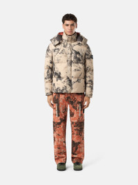 Cargo pants made from brushed cotton canvas printed with a camouflage pattern inspired by satellite images of Earth using two-color pigment on colored background. FABRIC RESEARCH AND TREATMENT Cargo pants made of a brushed cotton canvas printed with a camouflage pattern that takes inspiration from satellite images of planet Earth. Two-color pigment print on colored background. STYLE AND FIT Slanting hand pockets. Two back patch pockets with zipper fastening. Pocket on legs, with standing zipper fastening; the left one features the Stone Island badge. Under the leg pockets, hidden zipper to remove the lower leg and turn the pants into Bermuda shorts. Strap with snap on leg bottoms. Elasticized waistband with inner drawstring. Zipper fly. Relaxed fit. COMPOSITION AND CARE 100% Cotton