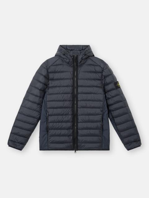 Jacket in a light stretch nylon with seamless feather tunnels that substantially increase the hold of the down. ‘Cire’ shiny finish. Garment dyed. FABRIC RESEARCH AND TREATMENT Light down hooded jacket made from 100% recycled light nylon that undergoes a special weaving technique to automatically create compartments on the loom. Seams are thus avoided, with the advantage of substantially increasing the hold of the feathers inside the chambers. The ‘cire’ finish applied to the fabric gives it a shiny appearance. The finished garment is padded via direct injection with the finest feathers, specifically treated to withstand the garment dyeing process. The addition of a special PFC-free agent to the dye formula makes the piece anti-drop. RDS - Responsible Down Standard certified. STYLE AND FIT Hood with contour drawstring with additional back pull. On-seam hand pockets with hidden zipper fastening. Flat side bands. Stone Island badge on the left sleeve. Elasticized tape at cuffs and bottom edge. Two-way zipper fastening on nylon herringbone band. COMPOSITION AND CARE Outside: 100% Polyamide / Nylon. Inside: 100% Polyamide / Nylon. Padding : Duck Down ( Minimum 90% Down ) 90% Duck Down 10% Duck Feather. Contains Non-textile Parts Of Animal Origin
