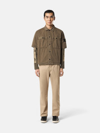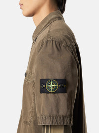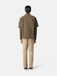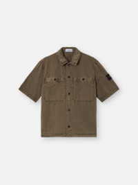 Short-sleeve shirt made from brushed organic cotton canvas with a slightly worn appearance, featuring chest pockets, and snap fastening. Garment dyed. FABRIC RESEARCH AND TREATMENT Short-sleeve shirt in brushed organic cotton canvas. Garment dyed with the 'OLD' treatment, an exclusive dyeing treatment and subsequent fading on the finished garment for a slightly worn and three-dimensional appearance. STYLE AND FIT Two chest pockets with top entrance and snap fastening on cotton tape. Stone Island badge on the left sleeve. Yoke on back. Snap fastening. Comfort fit. COMPOSITION AND CARE 100% Cotton