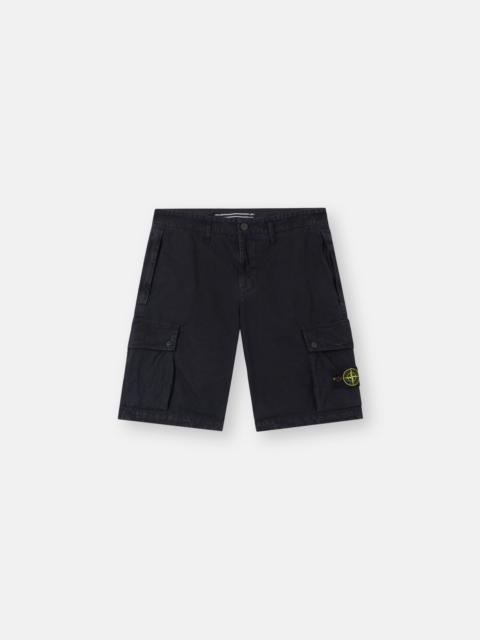 Cargo Bermuda shorts made from brushed cotton canvas featuring multiple pockets. Garment dyed with the 'OLD' treatment for a slightly worn appearance. FABRIC RESEARCH AND TREATMENT Cargo Bermuda shorts in brushed cotton canvas. Garment dyed with the 'OLD' treatment, an exclusive dyeing treatment and subsequent fading on the finished garment for a slightly worn and three-dimensional appearance. STYLE AND FIT Standing hand pockets with hidden zipper fastening. One slit back pocket with hidden snap fastening. Bellows patch pocket on legs with flap and snap fastening; the left pocket features the Stone Island badge. Zipper and button fly. Slim fit. COMPOSITION AND CARE External Fabric: 100% Cotton. Pocket Bag: 100% Cotton