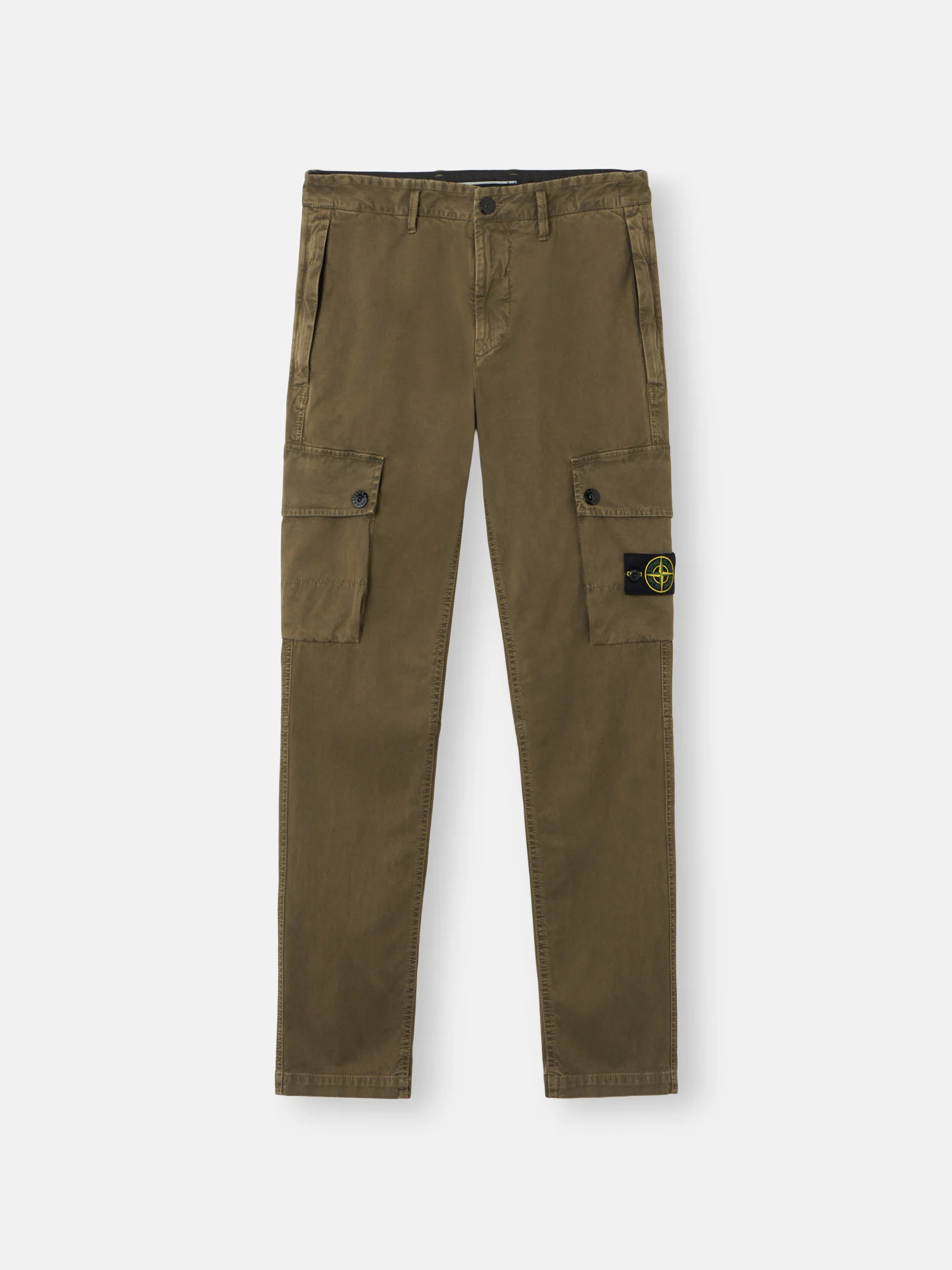 Cargo pants in stretch organic broken twill cotton, featuring zipper hand pockets and additional snap pockets. Garment dyed with the 'OLD' treatment for a slightly worn appearance. FABRIC RESEARCH AND TREATMENT Cargo pants in stretch organic broken twill cotton. Garment dyed with the 'OLD' treatment, an exclusive dyeing treatment and subsequent fading on the finished garment for a slightly worn and three-dimensional appearance. STYLE AND FIT Standing hand pockets with hidden zipper. One slanted back pocket with snap hidden under fixed flap. Bellows flap pocket on each leg with two snaps; Stone Island badge on left leg pocket. Zipper and button fly. Slim fit. COMPOSITION AND CARE 97% Cotton 3% Elastane / Spandex