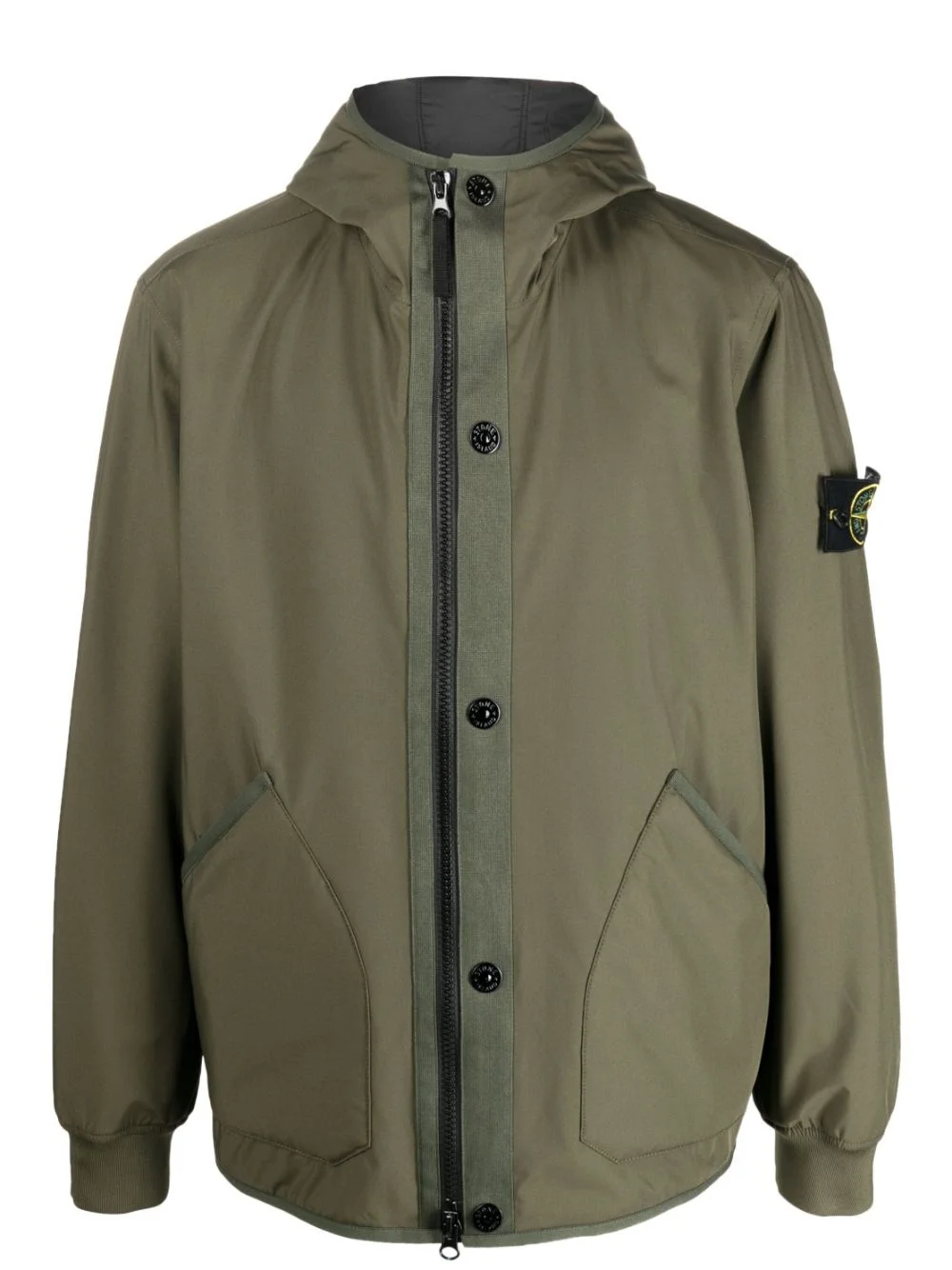 Compass-patch hooded jacket Highlights - Khaki greem - Signature compass motif - High neck - Classic hood - Front zip fastening - Front button fastening - Long sleeves - Elasticated cuffs - Two side pouch pockets - Curved hem Imported Composition Outer: Polyurethane 100%, Polyester 92%, Elastane 8% Lining: Polyester 100% SIZE & FIT Model measurements Height 6 ft 2 in(1.87 m) Bust/Chest 38.18 in(97 cm) Hips 36.61 in(93 cm) Waist 29.13 in(74 cm) FittingInformation Designed for a relaxed fit, this piece allows for comfort and movement when worn Made from a padded stretch fabric, giving it elasticity and a flexible fit This piece fits true to size – take your usual size