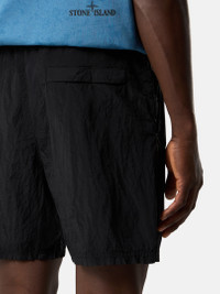Swim shorts in Nylon Metal made from ECONYL® regenerated yarns, featuring pockets, an elasticated drawstring waistband, and mesh lining. Garment dyed with a double-color recipe. FABRIC RESEARCH AND TREATMENT Swim shorts in Stone Island's iridescent Nylon Metal fabric. The evolution of this iconic fabric sees the use of ECONYL® regenerated yarns: the life-ended nylon, pre- and post-consumer, is recycled with a complex depolymerization process to create this fiber that features the same intrinsic characteristics of nylon from fossil raw material. Garment dyed with a double-color recipe. Nylon mesh lining. STYLE AND FIT Slanted hand pockets. One back pocket with zipper hidden under fixed flap. Stone Island Compass logo patch on lower left leg. Elasticated waistband with inner drawstring. Regular fit. COMPOSITION AND CARE External Fabric: 100% Polyamide / Nylon. Lining: 100% Polyamide / Nylon