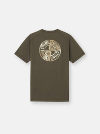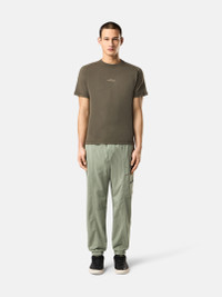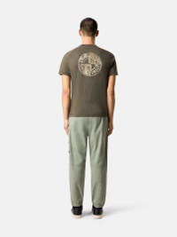 Short-sleeve T-shirt in organic cotton jersey with two-needle overlock seams, Stone Island logo on chest, and partially reflective 'Institutional One' print. Garment dyed. FABRIC RESEARCH AND TREATMENT Short-sleeve T-shirt in organic cotton jersey. Garment dyed. STYLE AND FIT Ribbed neckline. Raglan sleeves. Two-needle overlock seams on neckline, shoulders, sleeves, and bottom hem. Stone Island logo print on center of chest. Partially reflective 'Institutional One' print of the Stone Island Compass logo on the back. Slim fit. COMPOSITION AND CARE Garment: 100% Cotton. Ribbing: 100% Cotton