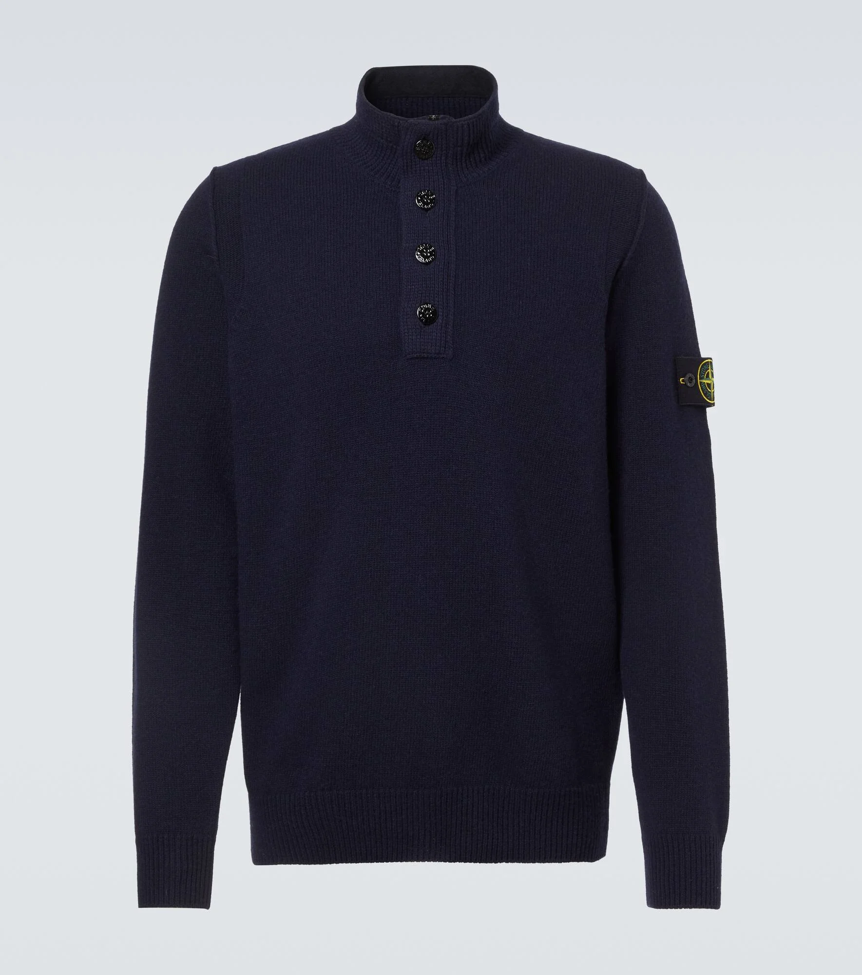This Stone Island polo sweater features a ribbed-knit design made from a soft wool blend, complete with ribbed trims and a partially buttoned front. This piece features the brand's signature Compass badge on the sleeve. Product Details - Material: 80% wool, 20% polyamide - Care instructions: hand wash - Made in Tunisia - Designer color name: Navy Blue - Item color: blue - Collar: turtleneck - Closure: partially buttoned front - Cuff: ribbed - Hem: ribbed - Item number: P01064112 Size & Fit - True to size - Straight fit - Slightly stretchy fabric - Falls to the hip - Height of model is 186cm-73" and wears a size L