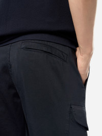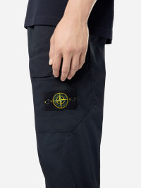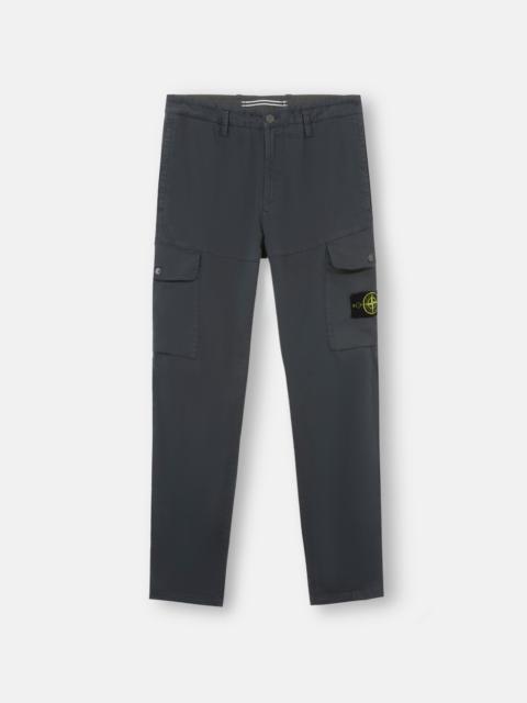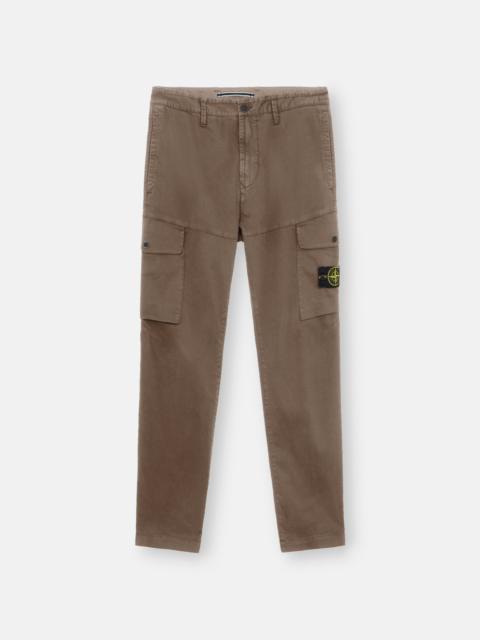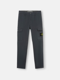 Cargo pants in organic stretch cotton satin, featuring hand pockets, one snap-fastened pocket on the back, and snap-fastened patch pockets on the legs. Garment dyed. FABRIC RESEARCH AND TREATMENT Cargo pants in organic stretch cotton satin. Garment dyed. STYLE AND FIT Welt hand pockets. One slit back pocket with hidden snap fastening. Bellows patch pocket with flap and snap fastening on the legs. Stone Island badge on the left leg pocket. Zipper and button fly. Regular fit. COMPOSITION AND CARE 98% Cotton 2% Elastane / Spandex