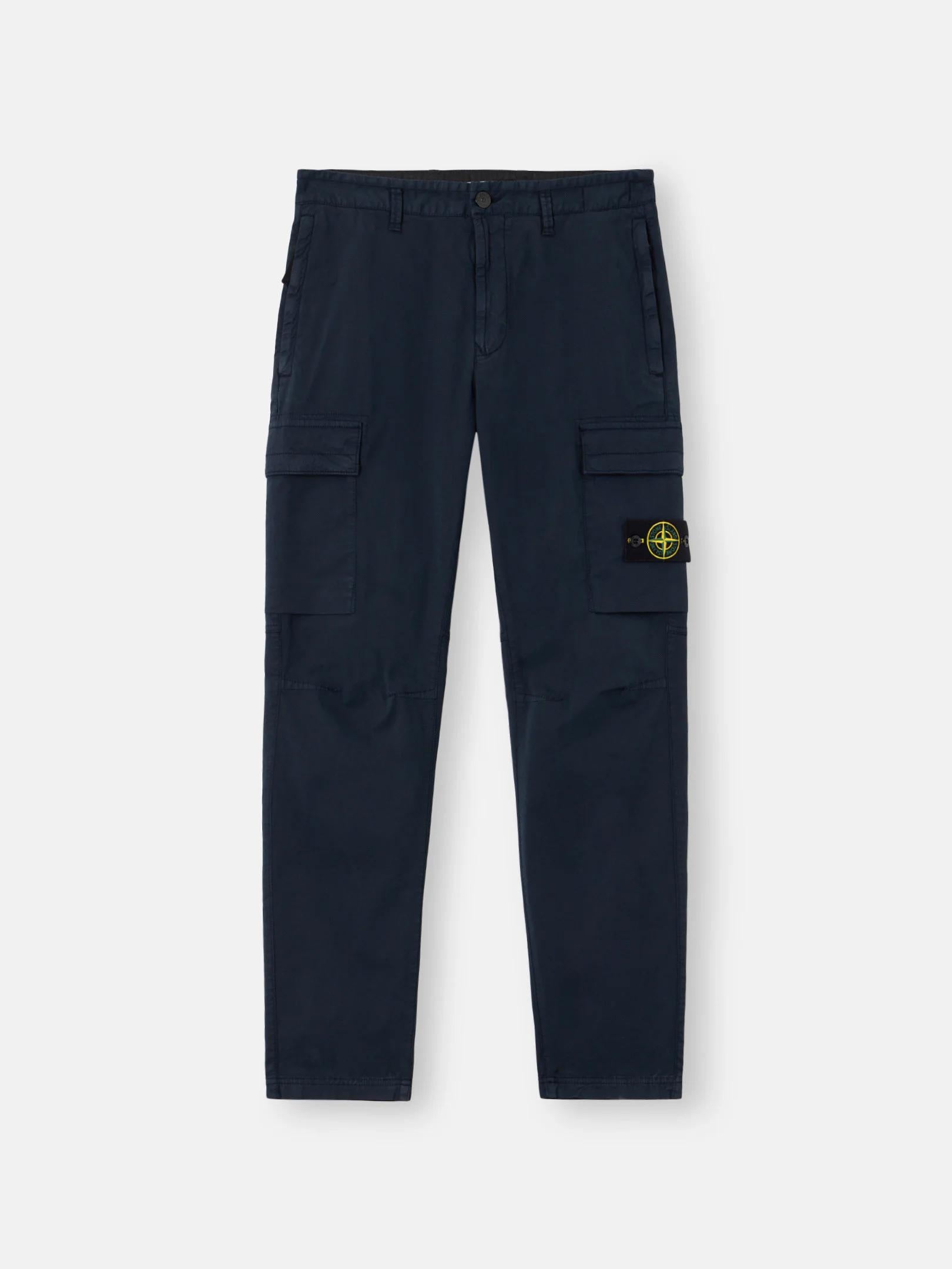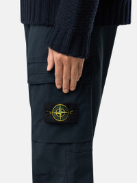 Cargo pants in stretch Supima® cotton twill, featuring hidden-zipper hand pockets and bellows leg pockets with hidden snaps, with zipper and button fly. Garment dyed. FABRIC RESEARCH AND TREATMENT Cargo pants in stretch Supima® cotton twill, made with mercerized Supima® cotton yarn, elasticated in the weft. Supima® - Superior Pima - is the guarantee certificate for the US origin of Pima cottons. This is the noblest species among cottons, due to the greater length, uniformity and strength of the fibers. Garment dyed. STYLE AND FIT Standing hand pockets with hidden zipper. One back pocket with hidden snap under fixed flap. Bellows flap pocket on each leg with hidden snaps; left pocket features Stone Island badge. Shaped knees. Zipper and button fly. Regular tapered fit. COMPOSITION AND CARE 97% Cotton 3% Elastane / Spandex