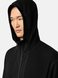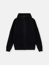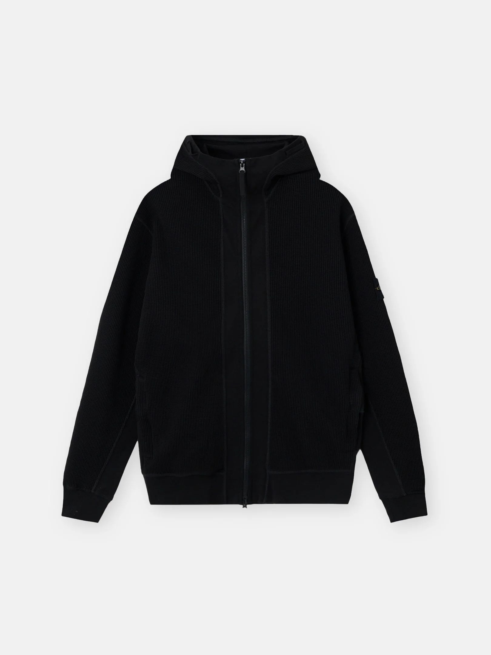 Zipper-up hooded sweatshirt in organic cotton waffle fleece, featuring ribbed inserts, zipper hand pockets, internal pockets, ribbed trims, and a two-way zipper. Heavyweight. FABRIC RESEARCH AND TREATMENT Zipper-up hooded sweatshirt in organic cotton waffle fleece. Heavyweight. STYLE AND FIT Lined hood with fixed tape drawstring. Ribbed inserts at hood contour, placket, sides, and underarms. Raglan sleeves on back. Vertical welt hand pockets with concealed zipper and internal tape reinforcement. Internal top-entry pockets. Stone Island badge on left sleeve. Ribbed cuffs and bottom band. Two-way zipper fastening. Overlock stitching at seams. Regular fit. COMPOSITION AND CARE External Fabric: 100% Cotton Secondary Fabric: 95% Cotton 5% Elastane / Spandex Hood Lining: 100% Cotton