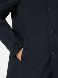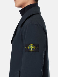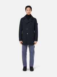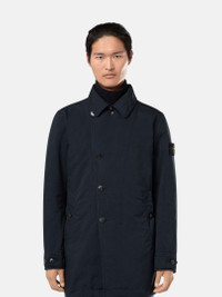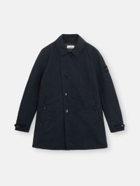 Trench coat in lightweight canvas made with a star-shaped cross-section Japanese substrate that is sewn and simultaneously garment dyed and treated with anti-drop agent. PrimaLoft® P.U.R.E™ padding. FABRIC RESEARCH AND TREATMENT Short trench coat in David-TC. Beginning with a star-shaped cross-section Japanese polyester/polyamide substrate, garments in David-TC are sewn and then simultaneously garment dyed and treated with an anti-drop agent. During the dying process, under pressure at 130°C, the fabric undergoes heat-induced compression, radically transforming its texture and construction for a truly unique tactile effect. The garment is engineered to be then padded with an inner layer of PrimaLoft® P.U.R.E™, an exclusive 100% recycled blend of ultra-small diameter fibers resulting in superior thermal performance. It delivers the highest warmth-to-weight ratio of all synthetic insulations. STYLE AND FIT Collar with sliding chinstrap and button fastening. Slanted hand pockets with snap fastening. Stone Island badge on the left sleeve. Adjustable straps at cuffs. Central back slit held by snap. Button fastening. COMPOSITION AND CARE Garment: 70% Polyester 30% Polyamide / Nylon. Lining: 100% Polyester. Padding: 100% Polyester