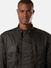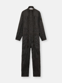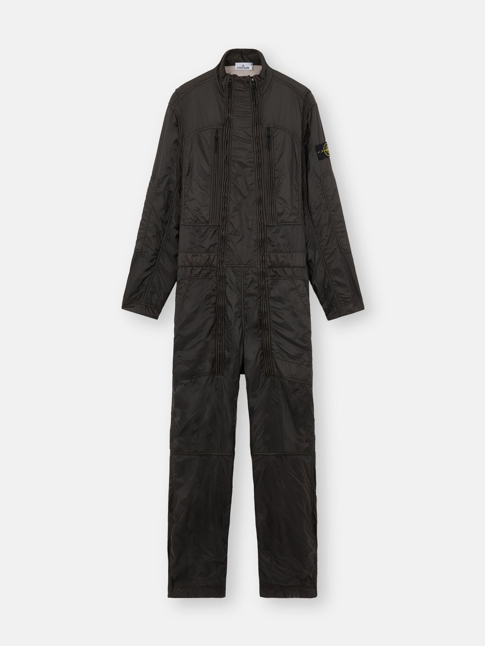 Jumpsuit in lightweight ultra-tightly woven nylon canvas with a silky appearance, lined in heavy cotton jersey. Garment dyed with double-color recipe. FABRIC RESEARCH AND TREATMENT Jumpsuit made of a lightweight ultra-tightly woven nylon canvas with a silky appearance, resin-coated inside for a windproof action. It is lined in a heavy cotton jersey. Garment dyed with double-color recipe. STYLE AND FIT Standing collar. Two long vertical zipper-fastened front pockets. Two long vertical zipper-fastened front openings, from collar to knees. Stone Island badge on the left sleeve. Reinforcing elbow patches in the same material. Tightening snap at cuffs. Elasticized waistline on front; on back, the top and pants are separated, both with independent elasticized band. Yoke on back. Tightening snaps at leg bottoms. COMPOSITION AND CARE Outside: 100% Polyamide / Nylon. Coating: 100% Polyurethanic Resin. Lining: 100% Cotton