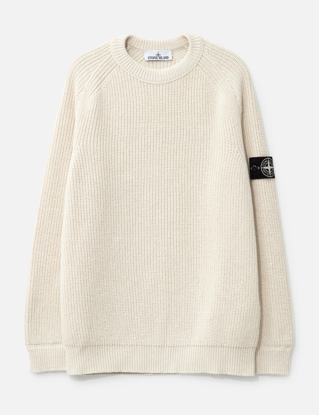 - Stone Island - Fisherman's Rib Cotton Raw Beauty Crewneck Jumper - Loose fit - Made from 70% recycled cotton - Gauge 5 knitted construction - Crewneck - Raglan sleeves - White logo badge on left sleeve - Large print on elbows - Flat cuffs - Color: Ivory - Material: 100% Cotton - See more Knitwear and Clothing - Model wears size M - Model measures: Height 186cm, Chest 34”/86cm, Waist 28”/71cm, Hip 36”/91cm - Vendor Code: S15 5100012 S00TA