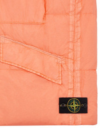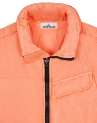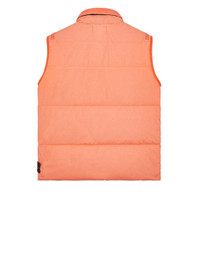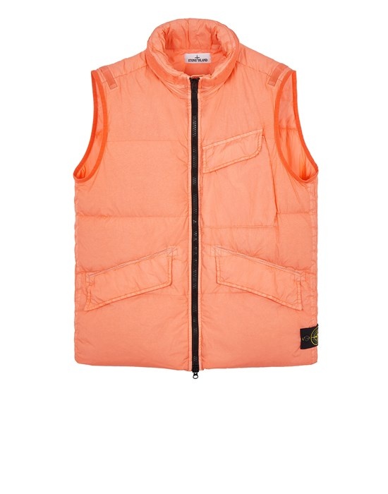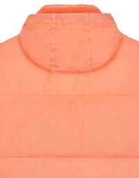 FABRIC RESEARCH AND TREATMENT GARMENT DYED CRINKLE REPS R-NY DOWN: Vest made in a 100% recycled light nylon rep with an ultra-tight weaving construction. The resin coating of its inner face makes it wind-resistant and mildly water-resistant. The finished piece has been filled with the finest down, appositely treated to bear the stress of the garment dyeing procedure. Extra lightness and comfort are achieved through the direct injection of the feathers and by a simplified construction of the down bags. Due to the resin treating of the material, the color penetrates unevenly into the material, lending a crinkle aspect to the surface. The addition of a special PFC-free agent to the dye formula gives the piece an anti-drop finish. STYLE Standing collar with horizontal tape hiding the entrance of the concealed hood. One patch pocket on chest, with flap and hidden snap fastening. Slanting hand pockets, with flap and hidden snap fastening. Nylon tape loops at shoulders. Armholes edged with tape. Stone Island badge on the left bottom side. Two-way zipper fastening. COMPOSITION External fabric: 100% Polyamide / Nylon - Coating: Polyurethane resin Secondary fabric: 100% Polyamide / Nylon Lining: 100% Polyamide / Nylon - Coating: Polyurethane resin HOOD LINING: 100% Polyamide / Nylon Padding (Feather): EIDERDOWN (Minimum 80% Down) 80% EIDERDOWN, 20% Feather Contains non-textile parts of animal origin