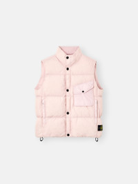 Down vest in recycled nylon rep with wind resistance and a crinkled texture, featuring chest pockets, drawstring in bottom hem, and two-way zipper. Treated with anti-drop. FABRIC RESEARCH AND TREATMENT Down vest in a 100% recycled light nylon rep with an ultra-tight weaving construction. The resin coating of its inner face makes it wind resistant and mildly water resistant. The finished piece has been filled with the finest down specifically treated to withstand the garment dyeing procedure. Extra lightness and comfort are achieved through the direct injection of the feathers and by a simplified construction of the down bags. Due to the resin treating of the material, the color penetrates unevenly into the material, lending a crinkle aspect to the surface. The addition of a special PFC free agent to the dye formula makes the piece anti-drop. RDS - Responsible Down Standard certified. STYLE AND FIT Standing down-padded collar. Chest bellows pocket on left side with triangular flap and snap. Standing hand pockets with hidden zipper. One inner pocket with Stone Island Compass logo embroidery and button fastening. Stone Island badge on bottom left side. Drawstring at hem. Two-way zipper under snap-fastened placket. COMPOSITION AND CARE Garment: 100% Polyamide / Nylon. Coating: 100% Polyurethanic Resin. Lining: 100% Polyamide / Nylon. Garment Detail Padding: 100% Polyester. Garment Padding: Duck Down (Minimum 80% Down) 80% Duck Down 20% Duck Feather. Contains Non-textile Parts Of Animal Origin