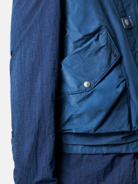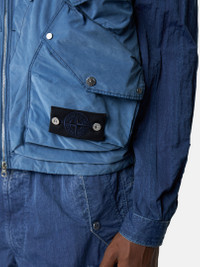 Utility vest in lightweight tela made with star-shaped cross-section yarns, featuring asymmetrical pockets, nylon tape details, and the Stone Island Denim Research badge. Garment dyed with indigo pigment and anti-drop. FABRIC RESEARCH AND TREATMENT Utility vest made from a lightweight tela woven with Japanese polyester/polyamide yarns featuring a star-shaped cross-section. The pieces are assembled and then dyed with indigo pigment and the addition of an anti-drop agent in a complex and exclusive dyeing process. During the garment dyeing process, the heat radically transforms the material’s hand and structure. The innovative combination of indigo and man-made fibers reflects Stone Island’s constant dedication to research and experimentation. STYLE AND FIT V-neckline. Thick nylon tape handle on shoulders that extends from front to back. At mid torso, slanted pockets with pleat and snap on nylon tape tab; left side features small diagonally placed pocket with flap and three snaps. Slanted puffed hand pockets with triangular flap and three snaps over second standing pockets; left pocket features Stone Island Denim Research badge with metal buttons. Adjustable nylon tape strap on sides at bottom. All-over contrast stitching. Two-way zipper fastening. COMPOSITION AND CARE External Fabric: 68% Polyester 32% Polyamide / Nylon. Lining: 100% Polyester