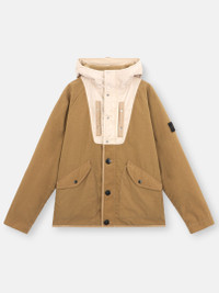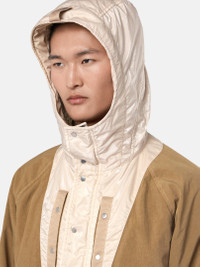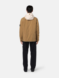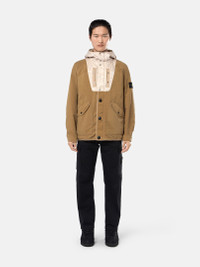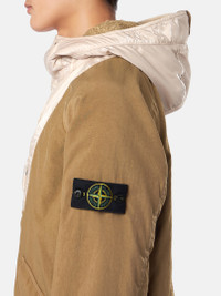 Jacket made from 100% nylon panama-weave fabric with parts in shimmering nylon canvas and cotton/polyester terry lining. Garment dyed with double-color recipe. FABRIC RESEARCH AND TREATMENT Hooded jacket made from 100% nylon panama-weave fabric. Parts of the garment are made from shimmering nylon canvas bonded to a glossy polyurethane film. Thanks to the uneven penetration into the fabrics, the dye bath gives the surface an uneven, marbled appearance. The piece is lined with cotton/polyester terry. Garment dyed with double-color recipe for unparalleled color finish, with the addition of a special PFC-free anti-drop agent. STYLE AND FIT Hood and chest appliques in New Silk Light, and two standing chest pockets with nylon tape trim and snap fastening. Raglan sleeves. Slanted hand pockets with flap and snap fastening. Stone Island badge on the left sleeve. Tightening snap at cuffs. Low back yoke. Two-way zipper fastening hidden by button-fastened placket. COMPOSITION AND CARE External Fabric: 100% Polyamide / Nylon. Hood: 100% Polyamide / Nylon. Coating: 100% Polyurethanic Resin. Body Lining: 60% Cotton 40% Polyester. Sleeve Lining: 100% Polyamide / Nylon. Sleeve Padding: 100% Polyester
