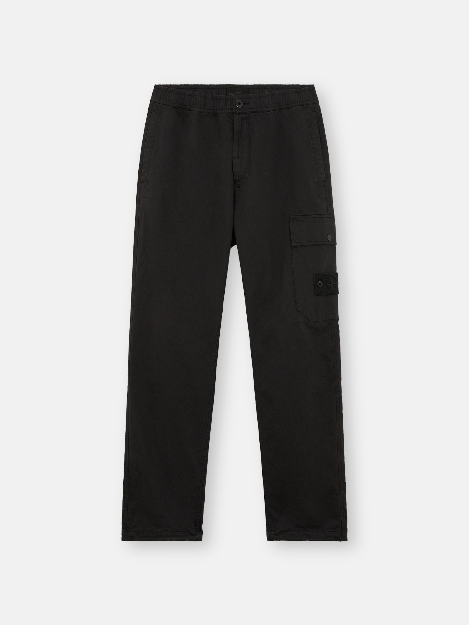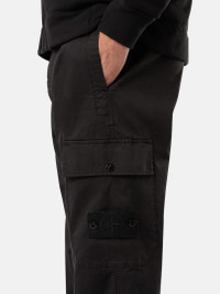 Cargo pants made of a stretch cotton-wool-satin blend featuring pockets, elasticized leg bottoms, and an elasticized waistband. Garment dyed. FABRIC RESEARCH AND TREATMENT Ghost pieces are based on the concept of camouflage and are totally monochromatic. Even their Stone Island badges have been created in a special mono-color version to blend with the garment. Cargo pants made of stretch cotton wool satin. Garment dyed. STYLE AND FIT Standing hand pockets. One slit back pocket, with hidden snap fastening. Patch pocket on the left leg, with flap and snap fastening; the pocket features the Stone Island Ghost badge. Elasticized drawstring into the leg bottoms. Elasticized waistband. Zipper and button fly. Regular fit. COMPOSITION AND CARE 93% Cotton 5% Wool 2% Elastane / Spandex