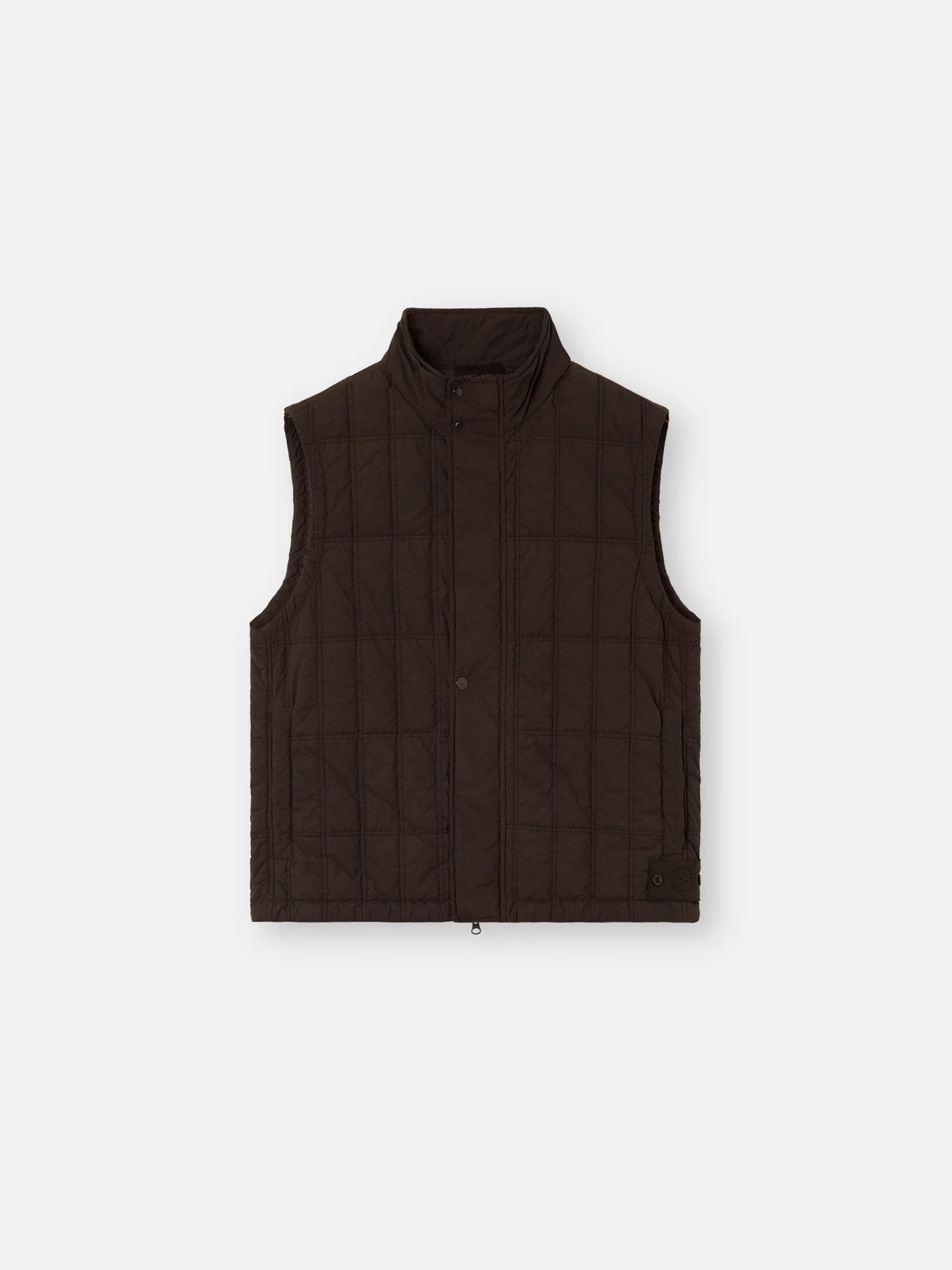 Vest in recycled nylon tela with soft and comfortable feel, featuring PrimaLoft®-TC padding, snap pockets, and concealed two-way zipper fastening. Garment dyed with anti-drop. FABRIC RESEARCH AND TREATMENT Vest made of a special recycled nylon tela. Thanks to its composition and to the brushing treatment, it offers a feeling of softness and comfort similar to cotton but with the durability and resistance specific to nylon fibers. Padded with PrimaLoft®-TC, an exclusive blend of high-performance insulating fibers, 70% recycled, engineered with Stone Island for garment dyeing. Garment dyed with the addition of a special anti-drop agent. STYLE AND FIT Standing collar. Standing pockets with concealed snap. Two internal pockets. Two-way zipper fastening under concealed snap placket. COMPOSITION AND CARE External Fabric: 100% Polyamide / Nylon. Lining: 100% Polyamide / Nylon. Padding: 100% Polyester