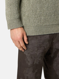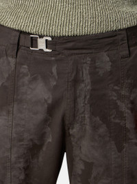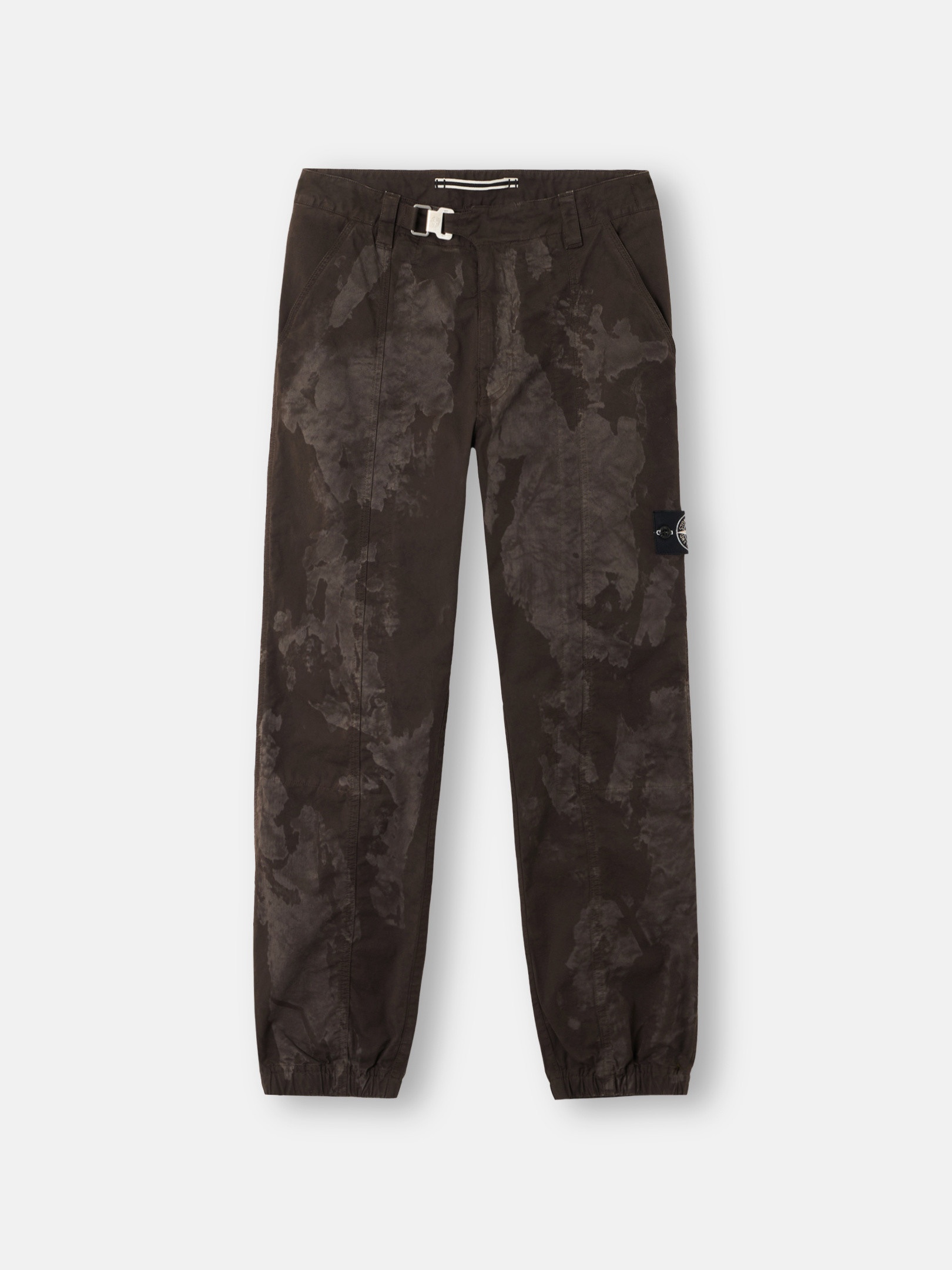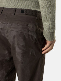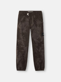 Sweatpants made from SUPIMA® stretch cotton twill featuring the white Stone Island research badge. Lasered with a camouflage graphic pattern that is revealed after garment dyeing. FABRIC RESEARCH AND TREATMENT Sweatpants in SUPIMA® stretch cotton twill. After a resin bath with subsequent drying, the garment is lasered with a camouflage graphic pattern revealed by the garment dyeing technique, with a tone-on-tone effect. STYLE AND FIT Slanted hand pockets. Yoke with flap on back hiding one zipper-fastened pocket. White Stone Island research badge on the left sleeve. Elasticated cuffs. Front belt with metal clip featuring the Stone Island Compass logo. Zipper fly. Regular fit. COMPOSITION AND CARE 97% Cotton 3% Elastane / Spandex