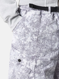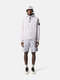 Cargo shorts made from a very fine stretch canvas featuring a nylon tape belt. The piece is garment dyed, then undergoes a white pigment treatment to create an all-over motif. FABRIC RESEARCH AND TREATMENT Cargo shorts made of a very fine stretch canvas and dyed with specific recipes. After drying, it undergoes a white pigment treatment and is then fixed through oven-drying. A final wash eliminates the color residues. STYLE AND FIT Slanted hand pockets. One back pocket with flap and snap fastening. Diagonal bellows pockets on legs with flap and snap fastening; Stone Island badge on the left pocket. Elasticated waistband with nylon tape buckled belt. Zipper fly. COMPOSITION AND CARE External Fabric: 100% Cotton. Pocket Bag: 100% Cotton