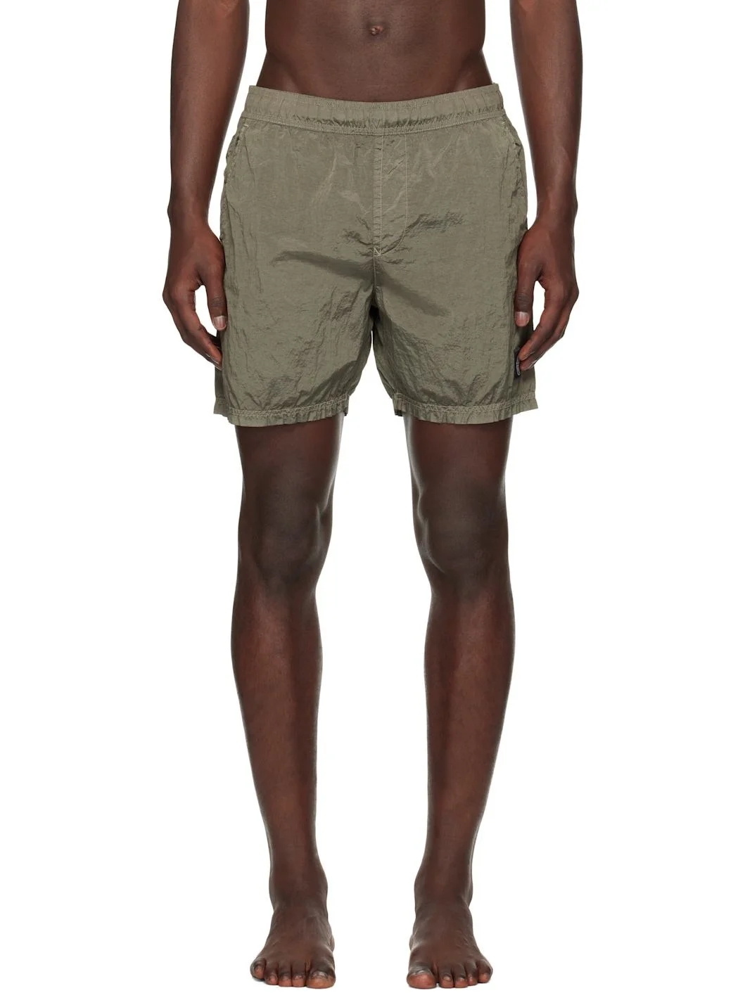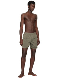 Crinkled ECONYL® regenerated nylon taffeta swim shorts. · Garment-dyed · Concealed drawstring at elasticized waistband · Three-pocket styling · Logo patch at cuff · Embroidered eyelets at back waist · Partial mesh lining Supplier color: Military green 100% regenerated nylon. Made in Indonesia 252828M193008